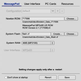 Changing many of the settings requires a restart of the Einstein application. Check Don;t show at startup to have Einstain launch the MessagePad emulation without showing the Settings panel. You can always call the Setting panel later using the pulldown menus. |