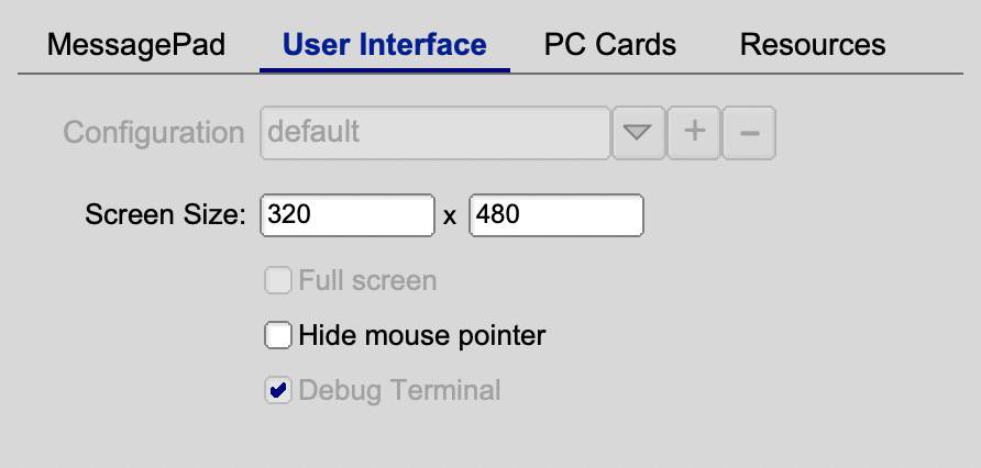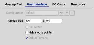 Screen SizeThe original MessagePad came with a resolution for 320 pixels horizontally by 480 pixels vertically in 16 shades of gray. You can choose bigger screen sizes and different aspect ratios. Selecting a smaller screen size is not recommended. When the emulator is running, the screen can be rotated using the Newton Extras Info menu. The eMate uses the same screen resolution in landscape mode. Rotating the screen is not useful on the original device. |