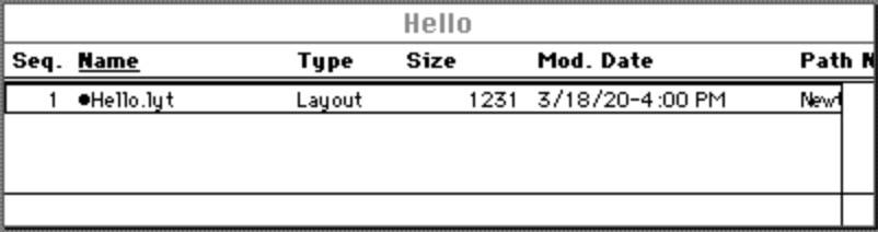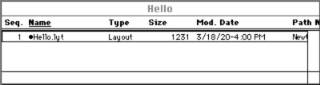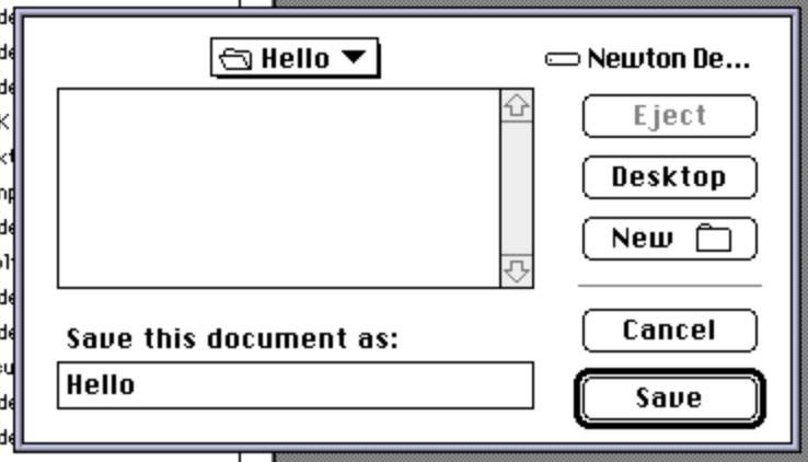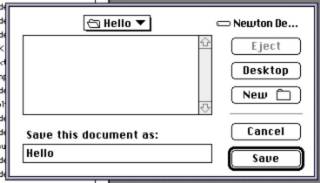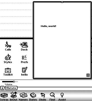 Press Apple-S to save the layout, Apple-1 to build the app, and Apple-2 to upload the app to the MessagePad, assuming the Inspector is still running. Now on the MessagePad, open the Extras folder and you should find a new app named "hello". Tap it, and your app should open a window to say hello to the world.