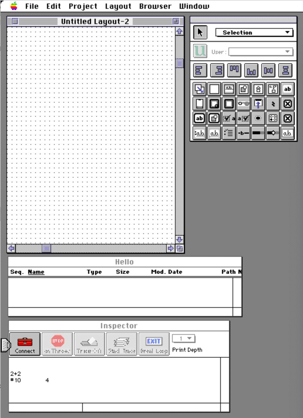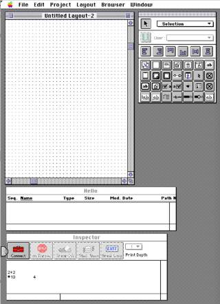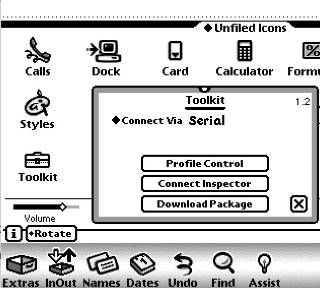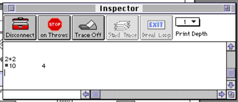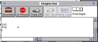 On the Mac side in NTK, press Apple-K, and the Inspector window will open and connect to the Newton. If both dialog boxes vanish, the connection was successful. In the Inspector window, type 2+2 and press Apple-Return. This launches an long chain of events: