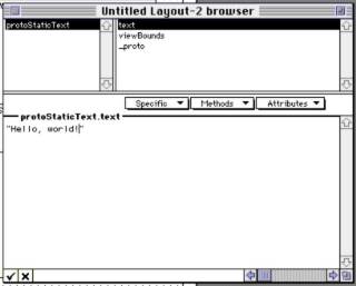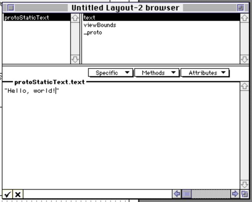 We want the static text field to say "Hello, world!", so double-click it in the Layout view which will open the hello.lyt Browser. Click on protoStaticText in the left list, then text in the right list. Replace the "Static Text" in the bottom view with "Hello, world!", including both quotes.