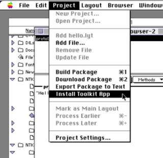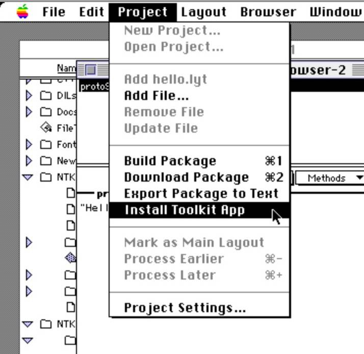 Go to NTK on Basilisk, choose Project >> Install Toolkit App, and after a few seconds, NTK should upload the Toolkit application to NewtonOS on your Einstein emulator.